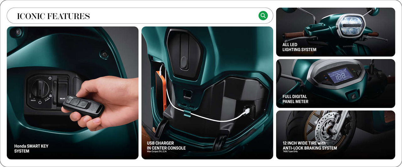 New Honda Stylo 160 juga didukung dengan fitur-fitur penunjang bagi pengendara yang modis, seperti rak depan, rak tengah yang disertai dengan penutup, lalu hadirnya fitur USB charger type A untuk mendukung rasa nyaman pengendara atas daya alat komunikasinya, serta ditunjang oleh Honda Smart key dan alarm system untuk memberikan rasa aman. Selain rak depan, untuk memudahkan pengendara dalam membawa tas atau barang yang tidak besar, New Honda Stylo 160 juga dilengkapi dengan gantungan yang dapat dilipat saat tidak digunakan. Fitur yang komplit dan canggih pada model ini akan memberikan kepuasan berkendara yang berkelas atas kebutuhan sehari-hari dalam beraktivitas pada setiap kesempatan.